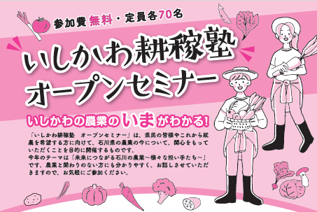 いしかわ耕稼塾「オープンセミナー」は、県民の皆様やこれから就農を希望する方に向けて、石川県の農業の今について、関心を持っていただくことを目的に開催するものです。